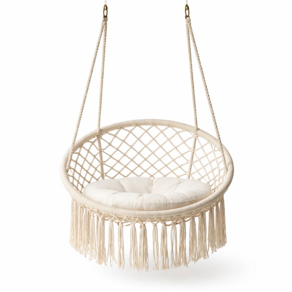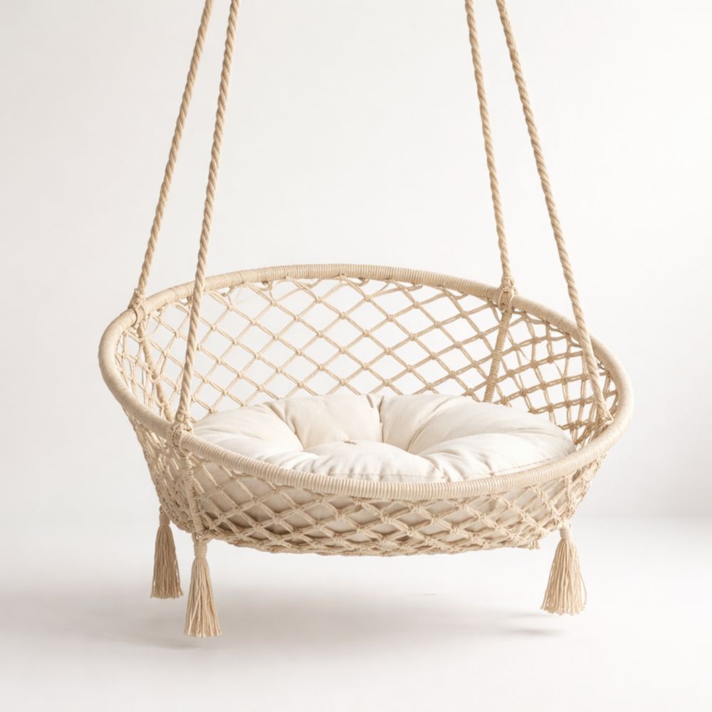 Sedia sospesa in corda di cotone con cuscino rotondo crema
